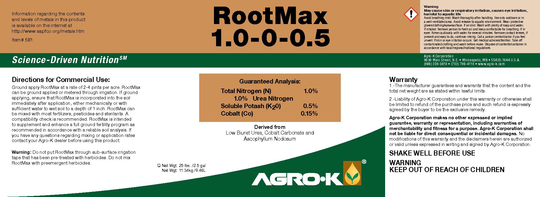 Ground apply Root Max at a rate of 1 to 4 pints per acre. Root Max can be ground applied or injected through most irrigation systems including drip and center pivots. If ground applying, ensure that Root Max is incorporated into the soil within two weeks after application, either mechanically or with sufficient water to wet soil to a depth of 1 inch. Root Max can be mixed with most fertilizers and pesticides. A compatibility check is recommended. Root Max is intended to supplement and enhance a full ground fertility program as recommended in accordance with a reliable soil analysis. If you have any questions regarding mixing or application rates contact your Agro-K dealer before using this product.