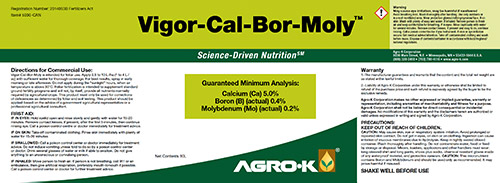 Vigor-Cal-Bor-Moly is intended for foliar use. Apply 1 to 4 pints per acre with sufficient water for thorough coverage. For best results, spray in early morning or late afternoon. Do not apply during the “sunlight” hours when air temperature is above 85°F. Foliar fertilization is intended to supplement standard ground fertility programs and will not by itself provide all nutrients normally required by agricultural crops. If you have any questions regarding mixing or application rates contact your Agro-K dealer before using this product.