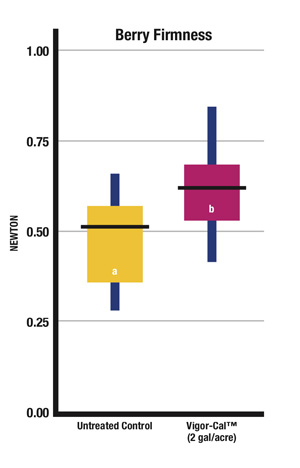 Increasing calcium levels in the tissue optimizes leaf cuticle and fruit skin development leading to bigger, firmer, better quality fruit that travels and stores longer. Physiologically, plant demand for calcium is highest during the early season from bloom through early fruit development when most cell division and elongation happens. It is during this period that calcium is most easily incorporated into the cell wall structure. Appropriately timed applications of Vigor-Cal, as part of a complete calcium and overall fertility program, can result in thicker cell walls of both the leaf and fruit tissue helping growers maximize fruit firmness and quality and minimizing problems related to calcium deficiencies.