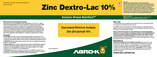 Zinc Dextro-Lac is intended for foliar use. Apply 1 to 8 pints per acre with sufficient water for thorough coverage. For best results, spray in early morning or late afternoon. Do not apply during the “sunlight” hours when air temperature is above 85° F/30° C. Foliar fertilization is intended to supplement standard ground fertility programs and will not by itself provide all nutrients normally required by agricultural crops. If you have any questions regarding mixing or application rates contact your Agro-K dealer before using this product.