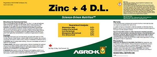 Apply 1 to 8 pints/acre with sufficient water for thorough coverage. For best results spray in early morning or late afternoon. Do not apply during the “sunlight” hours when air temperature is above 90°F. If you have any questions regarding mixing or application rates contact your Agro-K dealer before using this product. Zinc Plus+4 D.L. may be mixed with most fertilizers, insecticides and/or fungicides. A compatibility check is recommended. Check with your field representative for specific recommendations.