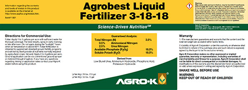 For annual crops, AGROBEST™ liquid plant food can be used as a starter fertilizer. Due to product purity, AGROBEST™ liquid plant food can be placed directly on the seed. If applying AGROBEST™ liquid plant food directly on the seed do not exceed 5 gallons per acre. Higher rates can be used, if desired, with offset placement. For perennial crops, AGROBEST™ liquid plant food can be band sprayed at the base of the plant at a rate of 1 to 4 gallons per acre with sufficient water to soak in. Alternatively, AGROBEST™ liquid plant food can be fertigated at rates of 1 to 2 gallons per acre. For best result it is recommended to fertigate low rates and apply more frequently when possible. Please contact your Agro-K representative with any specific questions regarding rates and timings of applying this product.
