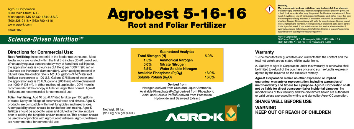 Agrobest 5-16-16 Category: Uncategorized Related products CLEAN Calcium Read more CLEAN BioMax Read more Zinc Dextro-Lac 10% Read more Multipurpose Micronutrients Read more