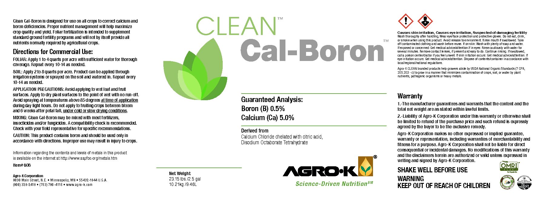CLEAN CAL-BORON is an organically chelated calcium fertilizer with boron designed for foliar application to correct calcium and boron deficiencies. Clean Cal-Boron is derived from a natural brine solution calcium chloride. The natural organic chelation process used combined with Agro-K’s proprietary fermentation manufacturing process produces a fertilizer that is soft on plant tissue and rapidly adsorbed to meet the nutritional needs of all developing crops.