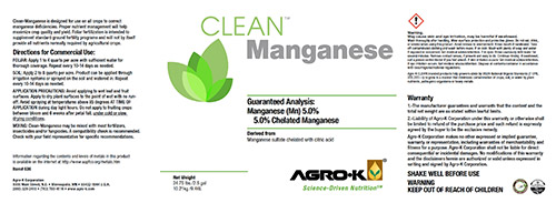 Clean-Manganese is designed for use on all crops to correct manganese deficiencies. Proper nutrient management will help maximize crop quality and yield. Foliar fertilization is intended to supplement standard ground fertility programs and will not by itself provide all nutrients normally required by agricultural crops.