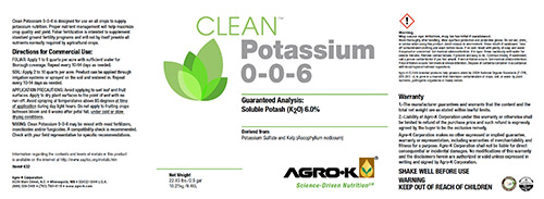 Clean Potassium 0-0-6 is designed for use on all crops to supply potassium nutrition. Proper nutrient management will help maximize crop quality and yield. Foliar fertilization is intended to supplement