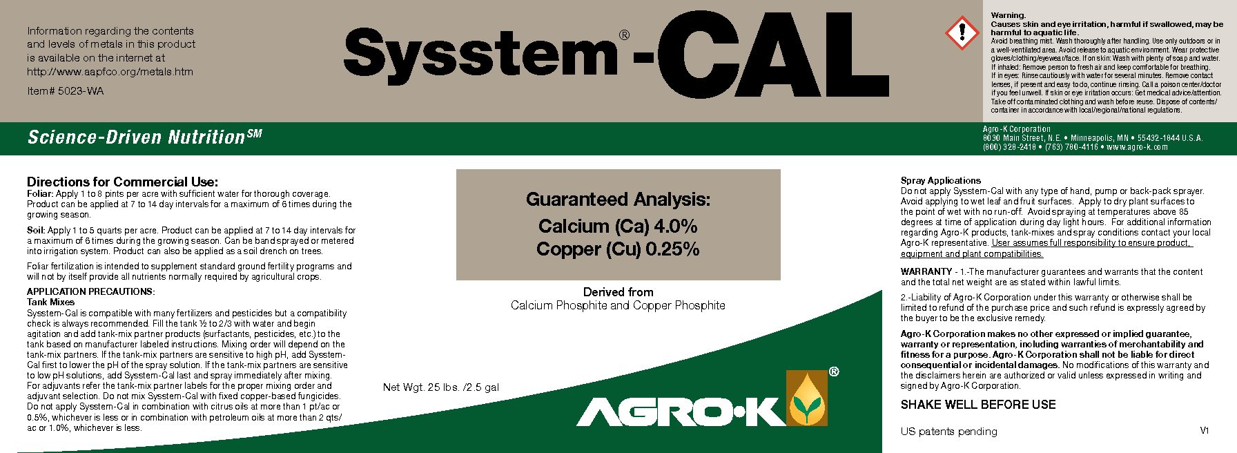 Sysstem-Cal is intended for foliar use only. Foliar: Apply 1 to 5 quarts per acre (2.5 to 10 liters per hectare) with sufficient water for thorough coverage. Do not apply during the “sunlight” hours when air temperature is above 85° F/30° C. Foliar fertilization is intended to supplement standard ground fertility programs and will not by itself provide all nutrients normally required by agricultural crops. If you have any questions regarding mixing or application rates contact Agro-K before using this product. Sysstem-Cal is compatible with many fertilizers and pesticides, but compatibility checks are recommended before mix. If mixing Sysstem-Cal with other products, dilute Sysstem-Cal in a full spray tank first before adding other products. Sysstem-Cal should not be mixed with pesticides or other products that are sensitive to low pH solutions.