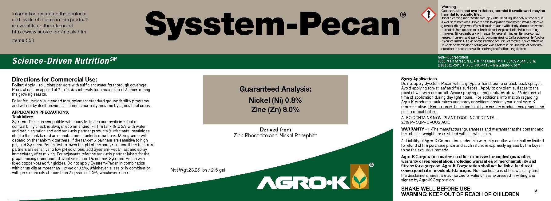 Apply 1 to 4 quarts per acre per application. Apply first application after bud break during early leaf expansion. Make subsequent applications on 7-21 day intervals as indicated by the crop. Apply no more than 5 applications annually. Foliar apply with air-blast type sprayers in a minimum of 40 gallons of water per acre. Sysstem-Pecan is compatible with other Agro-K Sysstem products and can be tank mixed for application. Consult your crop advisor for more information.