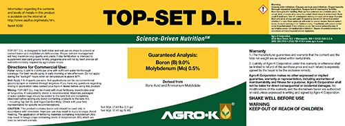 TOP-SET D.L. is designed for both foliar and soil use on crops to prevent or correct boron and molybdenum deficiencies. Proper nutrient management will help maximize crop quality and yields. Foliar fertilization is intended to supplement standard ground fertility programs and will not, by itself, provide all nutrients normally required by agricultural crops.