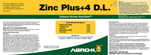 Apply 1 to 8 pints/acre with sufficient water for thorough coverage. For best results spray in early morning or late afternoon. Do not apply during the “sunlight” hours when air temperature is above 90°F. If you have any questions regarding mixing or application rates contact your Agro-K dealer before using this product. Zinc Plus+4 D.L. may be mixed with most fertilizers, insecticides and/or fungicides. A compatibility check is recommended. Check with your field representative for specific recommendations.