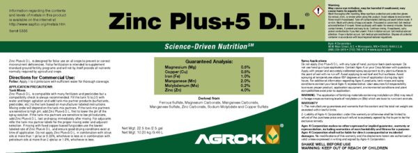 Agro-K’s Zinc Plus+5 DL™, is a foliar micronutrient containing zinc, manganese, magnesium, iron, molybdenum and copper utilizing Agro-K’s Dextro-Lac manufacturing process to create carbohydrate based nutrients. The Dextro-Lac® process creates a foliar micronutrient product that can quickly penetrate plant tissue and can be easily metabolized. Because Zinc Plus+5 DL can penetrate quickly and requires less expended energy to metabolize than other nutrient forms, Zinc Plus+5 DL increases nutrient efficiency.