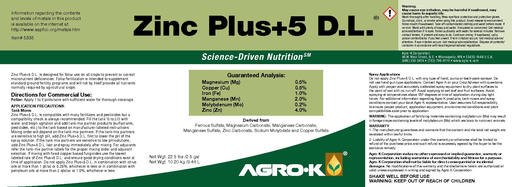 Apply 1 to 4 quarts per acre per application. Apply first application start of rapid leaf development. Apply subsequent applications at 7-14 day intervals based on tissue analysis and nutrient levels. Foliar apply with air-blast type sprayers with sufficient water for thorough coverage. Zinc+5 DL can be tank mixed with copper applications. Zinc+5 DL can also be applied with husk fly and codling moth spray programs. Consult your crop advisor for more information.