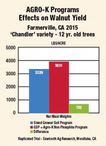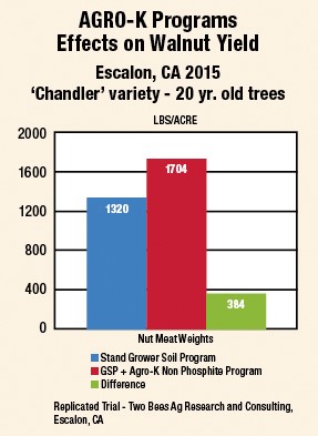Due to continuing concerns about the use of phosphite based inputs in walnuts and other nut crops as a result of European Union regulations, Agro-K, in 2015 began multi-year trials with two independent contractors, Brooks Bauer with Two Bees Agricultural Research & Consulting, Escalon CA and Steve Deitz of Sawtooth Ag Research, Woodlake, CA, to demonstrate that a comprehensive Agro-K soil and foliar nutrition program without phosphite based materials can improve nut meat yield.